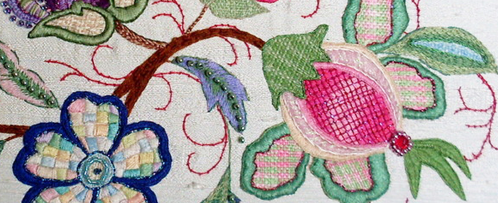 ‘I thought I would send in some photos of my latest finished piece: ‘A Sherry for Jack’ by Hazel Blomkamp on silk dupion. I love Hazel’s designs and had a lot of fun embroidering this piece.’
