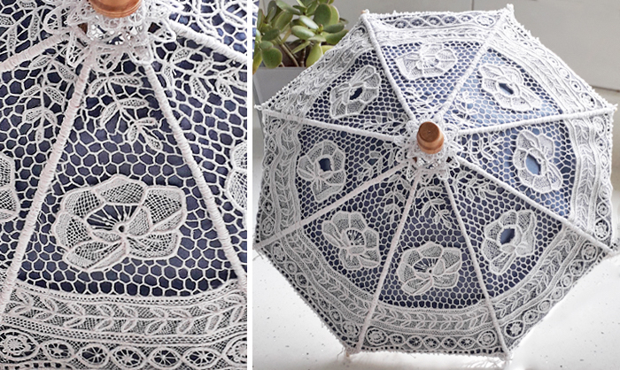 ‘I have stitched all my life and always have several projects on the go. In 2012, ready for a new challenge, I started to learn needlelace. I designed this parasol myself and it took two years to complete.’