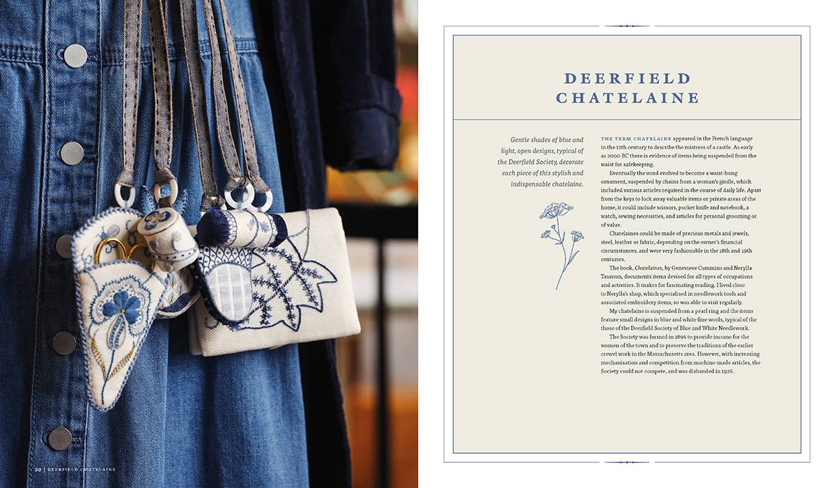 Gentle shades of blue and light, open designs, typical of the Deerfield Society, decorate each piece of this stylish and indispensable chatelaine.