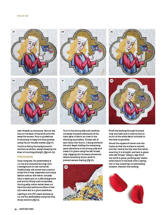 Heloise is worked primarily with these stitches using filament silk and gilt passing; her large eyes, bright colours and strong outlines are typical of this style.