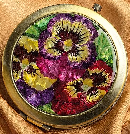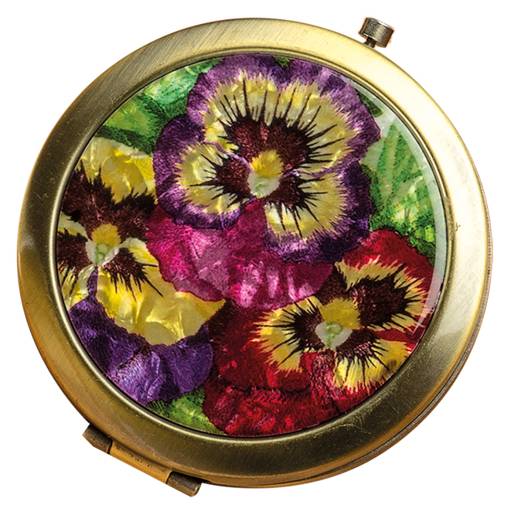 Incorporating the glorious threadpainted pansies of the evening bag, the compact has a diameter of 7cm (2 ¾” ) opens with a push button clasp, contains two mirrors and is finished with an antique gold coloured rim.