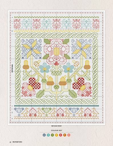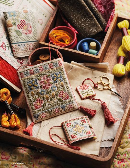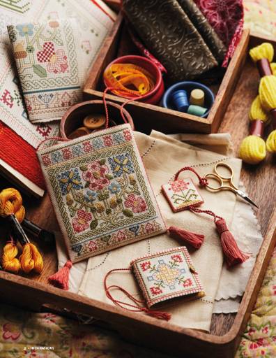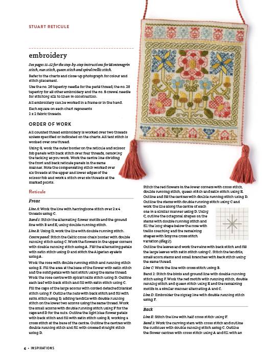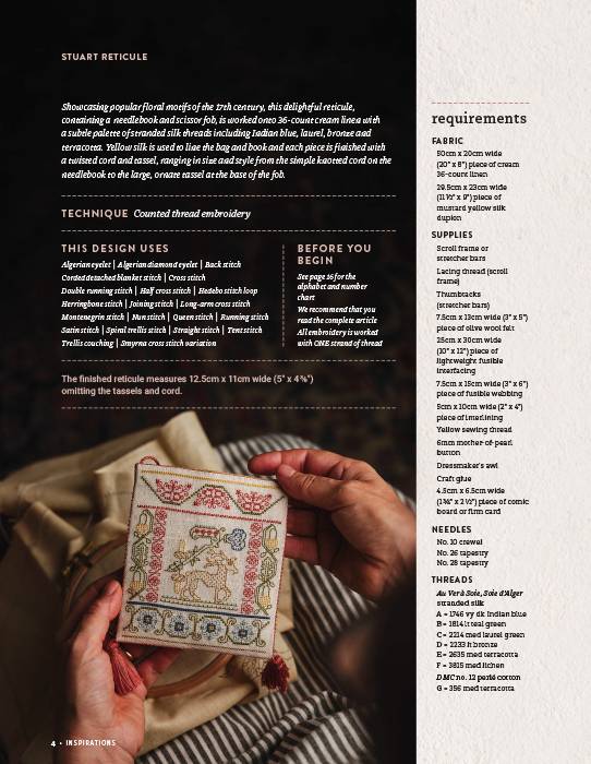 Showcasing popular floral motifs of the 17th century, this delightful reticule, containing a needlebook and scissor fob, is worked onto 36-count cream linen with a subtle palette of stranded silk threads including Indian blue, laurel, bronze and terracotta.